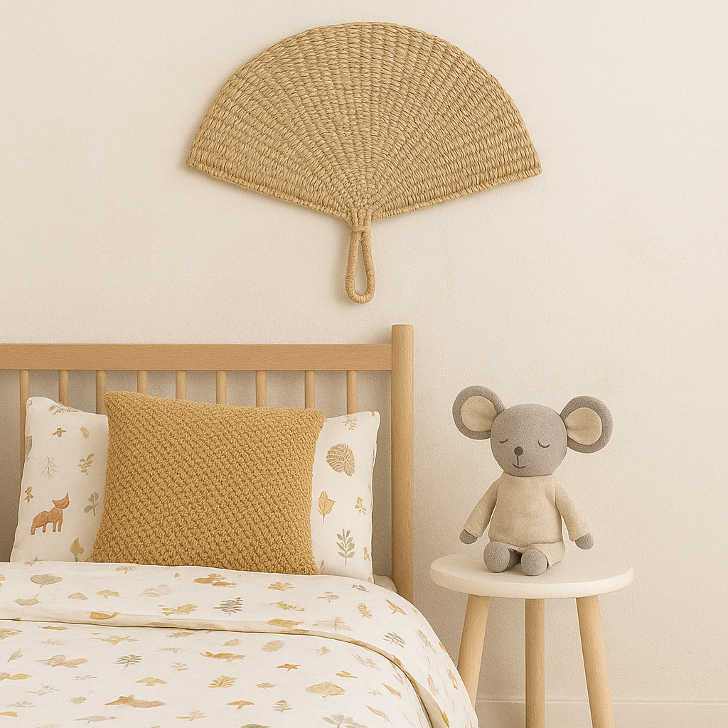 Los abanicos de paja tejidos a mano pueden utilizarse como elementos decorativos en la habitación de un niño para lograr un estilo rústico, boho o nórdico. Los abanicos de paja natural son valorados por ser productos ecológicos y artesanales, lo que los convierte en opciones únicas para la decoración del hogar. Se pueden colgar en la pared para crear un punto focal decorativo. También se pueden combinar con otros elementos de materiales naturales como el mimbre y la madera para complementar el estilo.