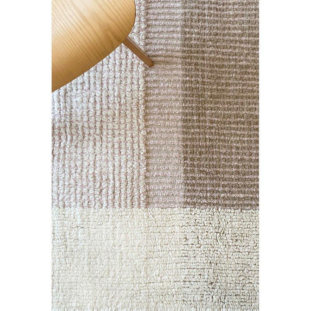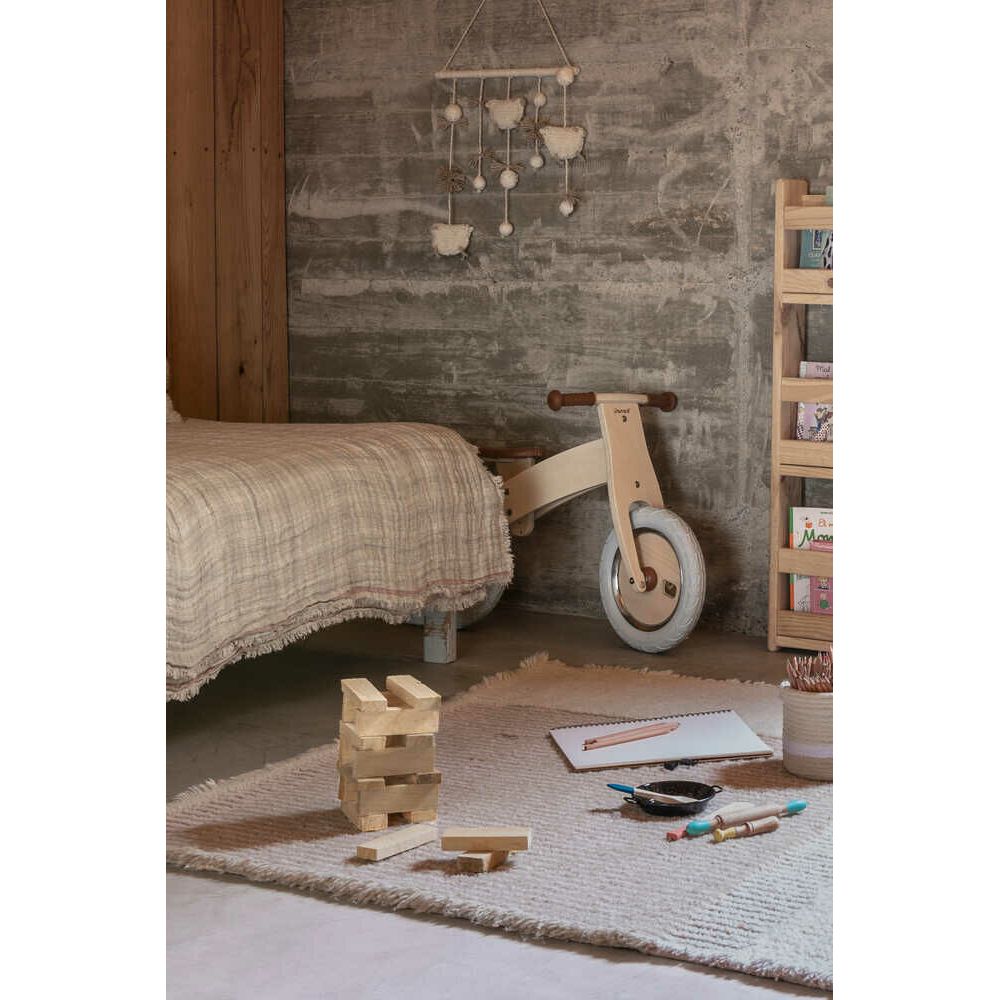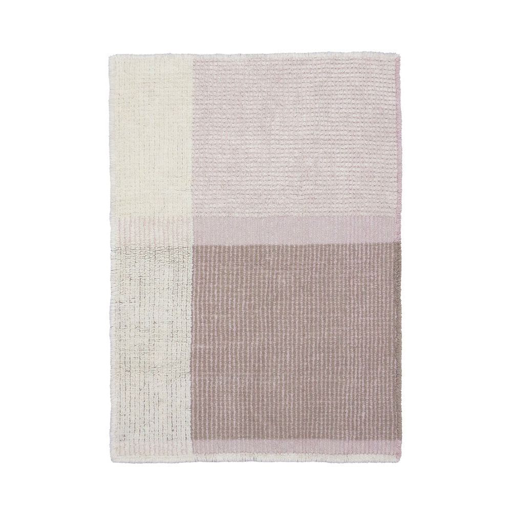 Inspirada en los típicos patrones de cuadros teñidos en hilo de las mantas tejidas tradicionalmente, la alfombra Kaia presenta líneas horizontales y verticales que se cruzan formando un patrón de cuadros tricolor. Acabado en todo el perímetro con lana de pelo largo de 3 cm.
