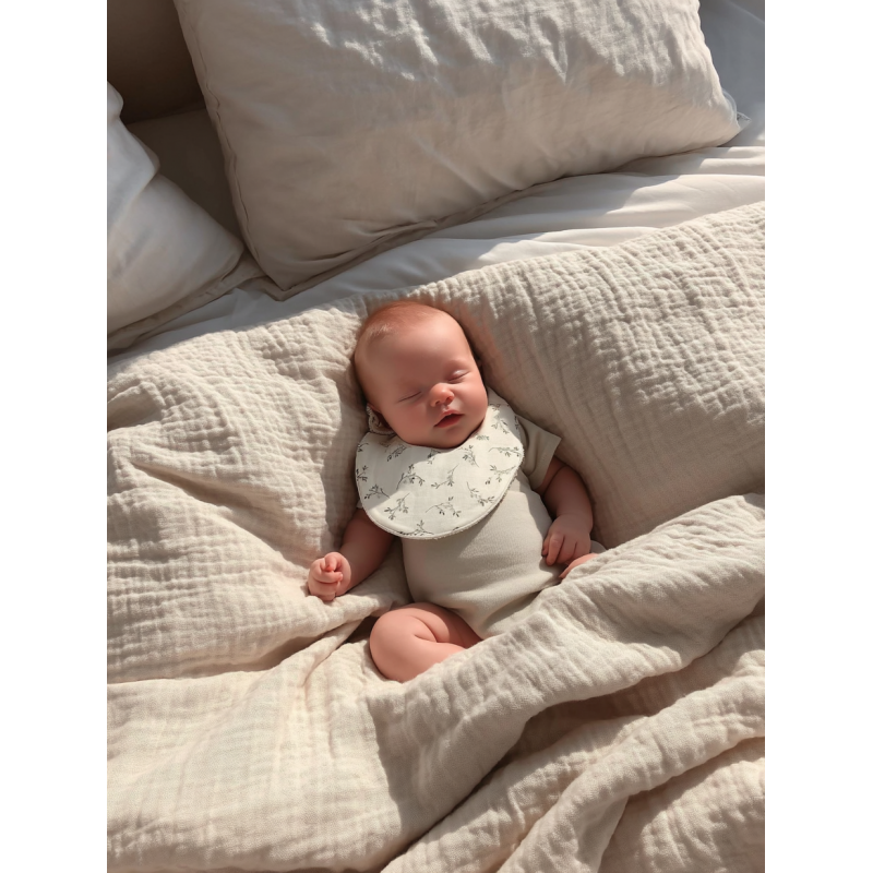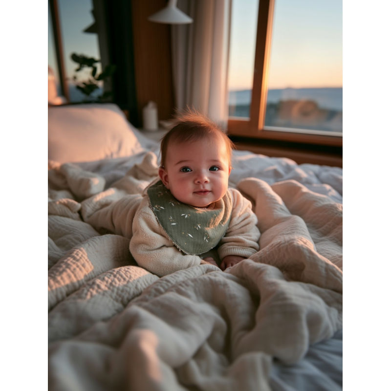 Un imprescindible para tu bebé. Babero para los primeros meses y hasta un año, lo usarás sin parar. Combina una gasa de algodón organico con su reverso en rizo de algodón 100% Oeko-Tex. Cierre velcro en el lateral para que lo coloques y quites facilmente sin tener que manipularlo detrás de su cuello.