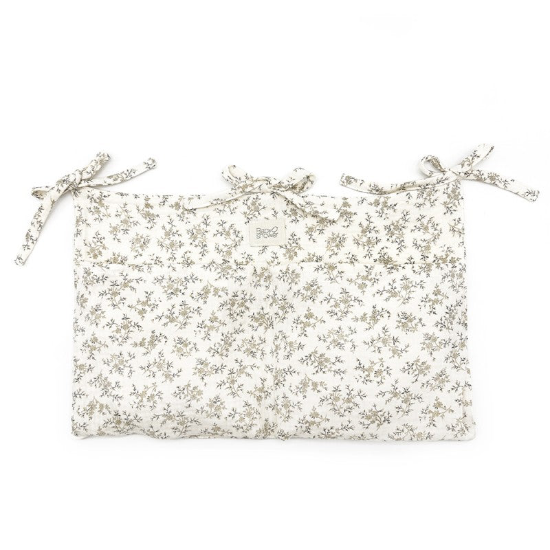 Practico organizador de cuna para atar en los barrotes y almacenar los pequeños accesorios tan necesarios a la hora de dormir a tu bebe. Dispone de dos bolsillos y está confeccionado en 100% algodón orgánico