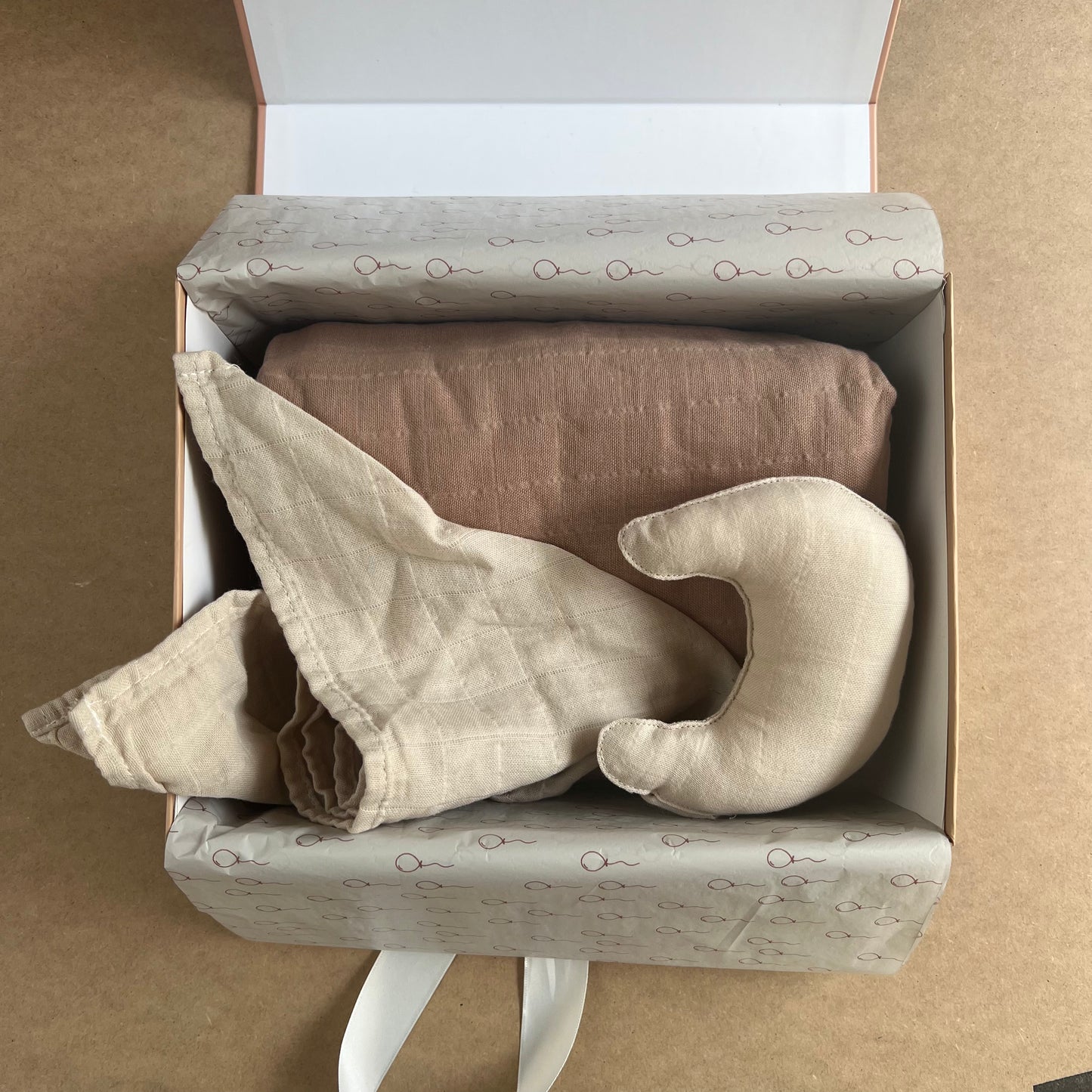 La caja tiene un maravilloso diseño con cierre de imán y cinta de seda, en su interior contiene un swaddle y un tuto de apego hechos de algodón orgánico en una linda paleta de colores. Es un lindo regalo lleno de detalles y delicado.