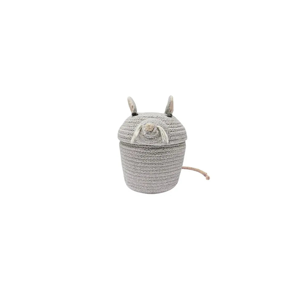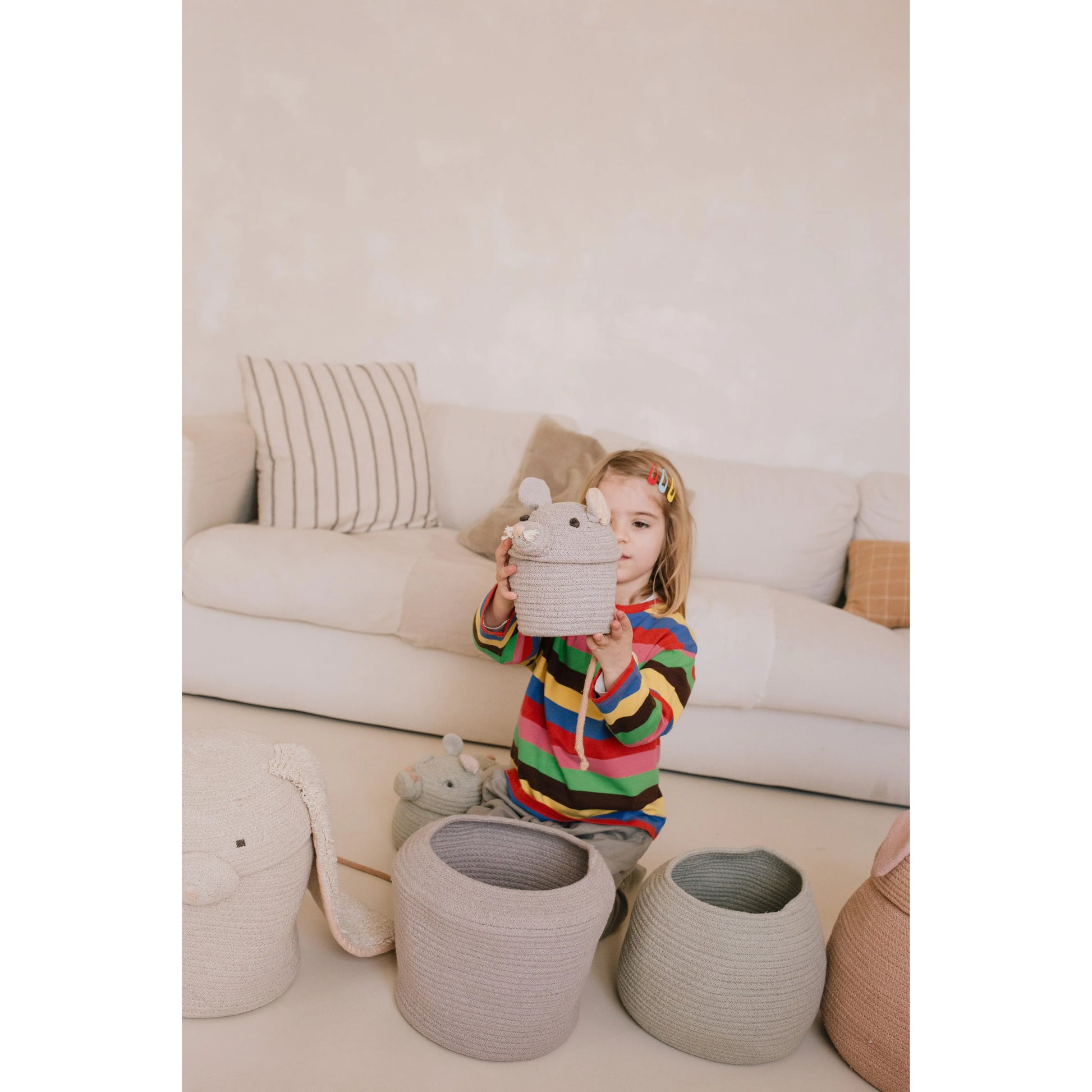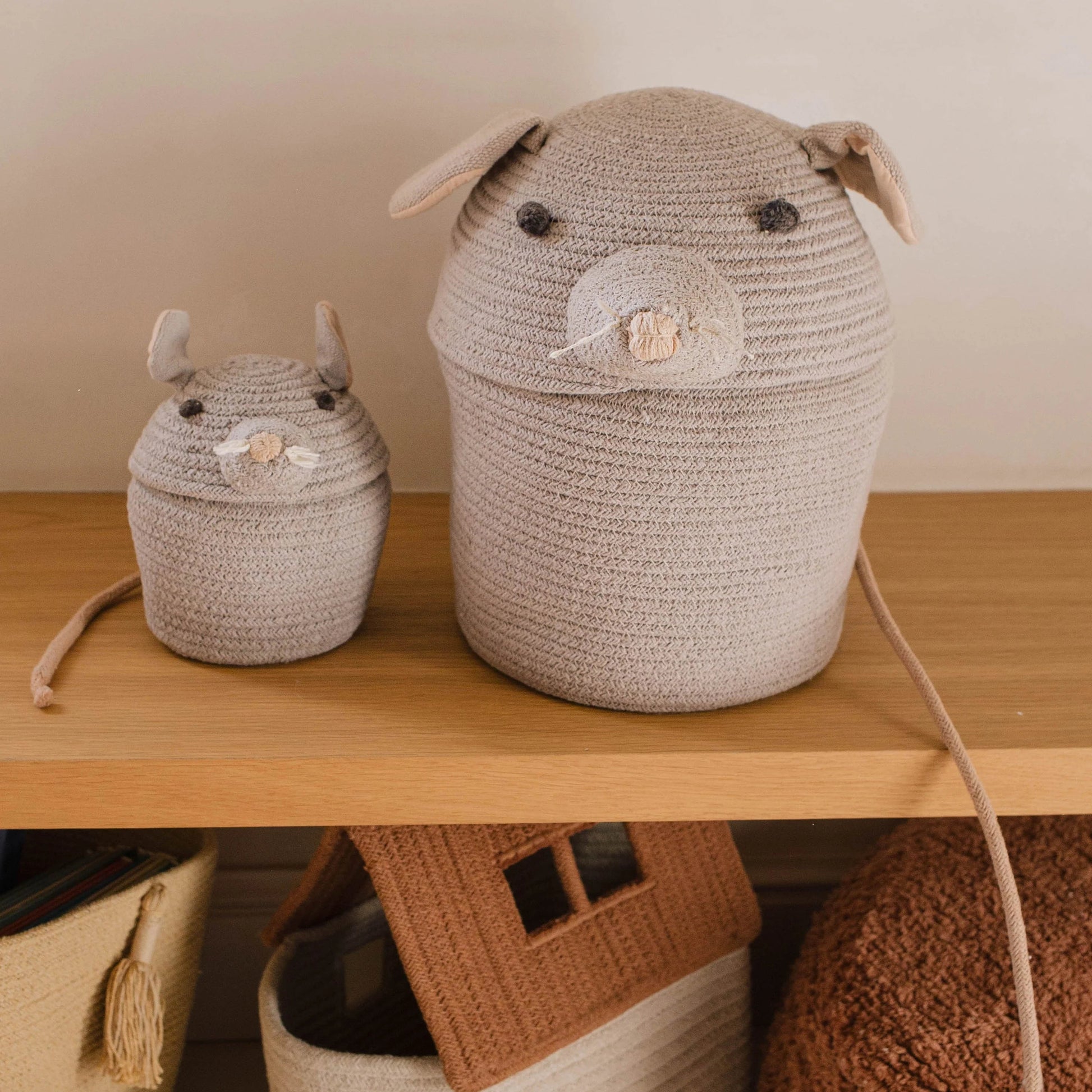 Con una parte base ligeramente cono en gris perla y una nariz puntiaguda, las orejas de lona gris y la cola larga rosa le dan a esta cesta el toque final.