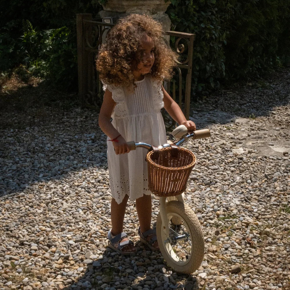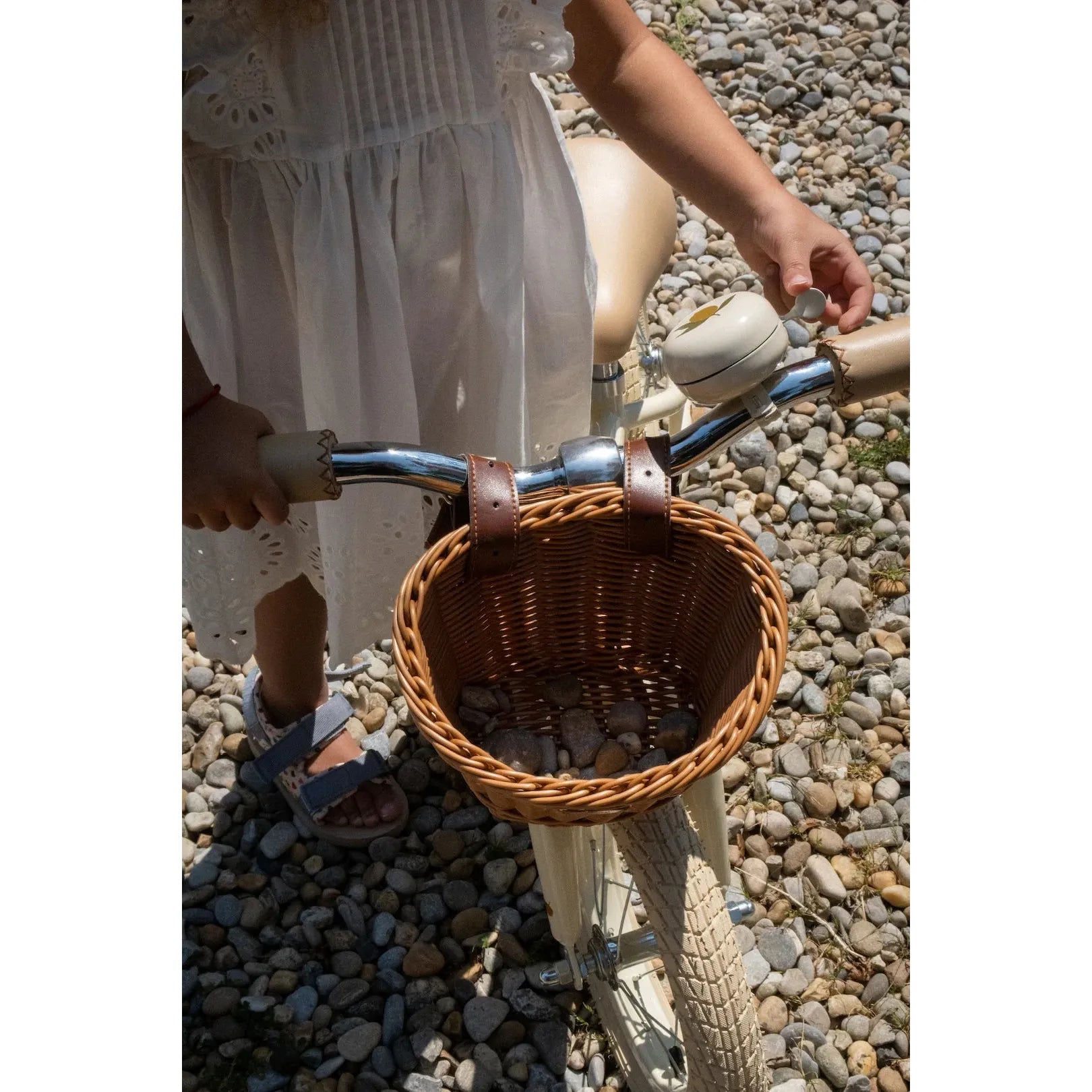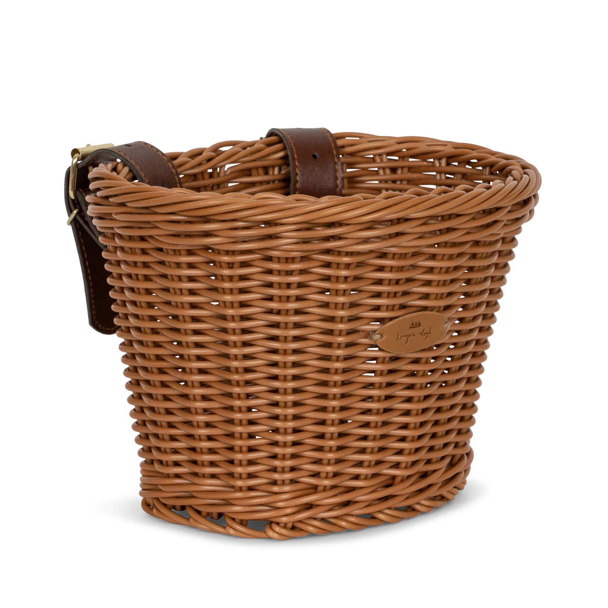 Preciosa cesta de mimbre para bicicleta de Konges Sløjd. Diseñada con dos correas para facilitar su fijación a bicicletas y bicicletas de equilibrio.