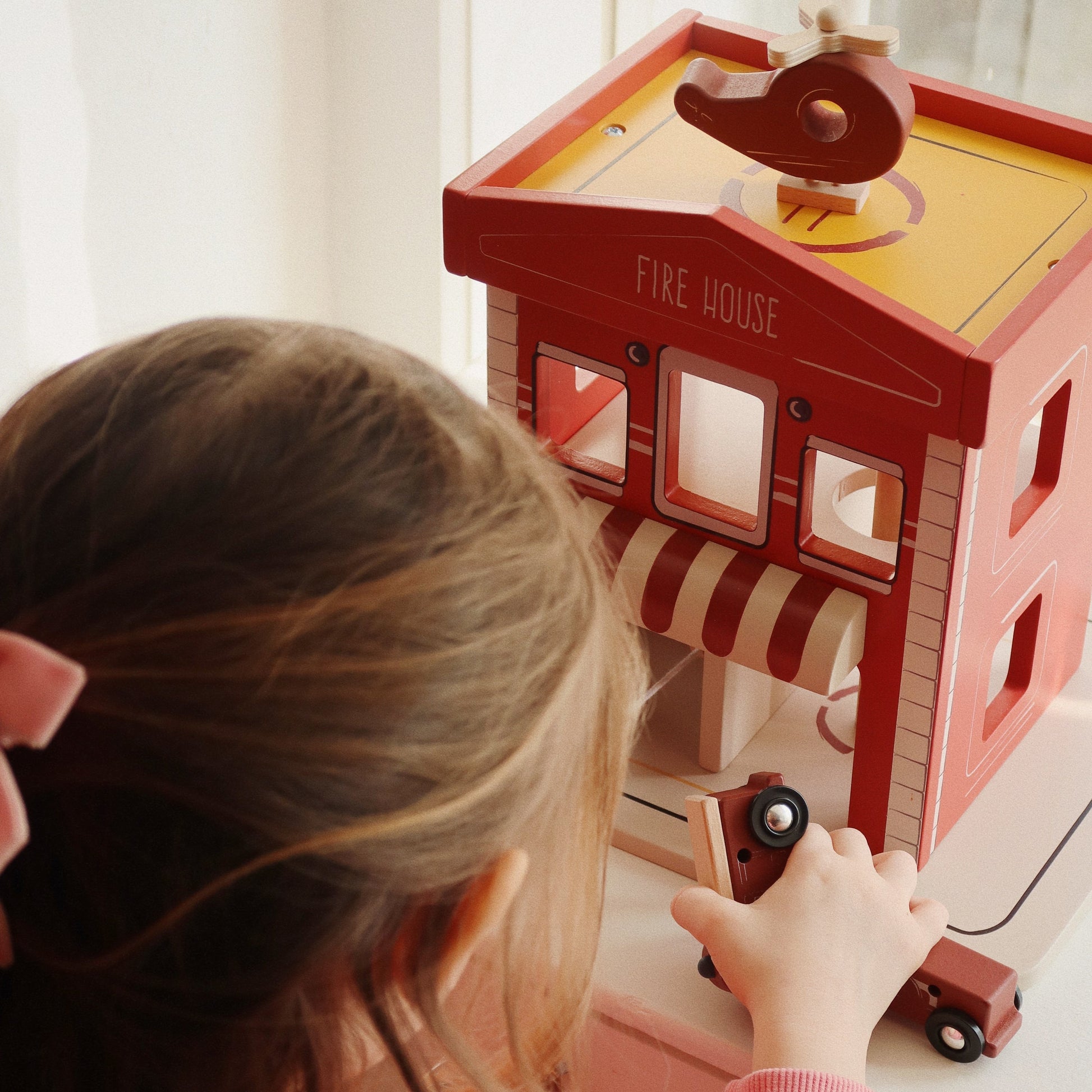 Estación de bomberos de madera para horas de diversión y juego. La estación incluye un camión de bomberos, un coche y un helicóptero, ¡todo listo para entrar en acción en caso de emergencia!