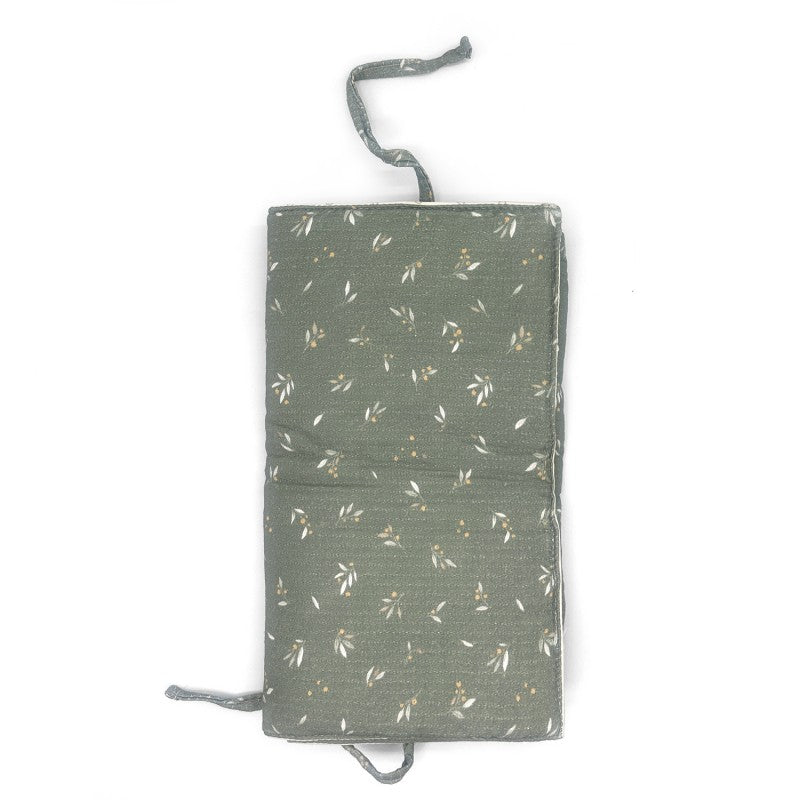 Cambiador de paseo para que te sirva de apoyo y puedas cambiar el pañal del bebé en cualquier lugar. Su tamaño compacto lo hace el compañero ideal para las bolsas de carrito pequeñas. Cierre con lazo e interior en algodón orgánico con acabado repelente al agua.