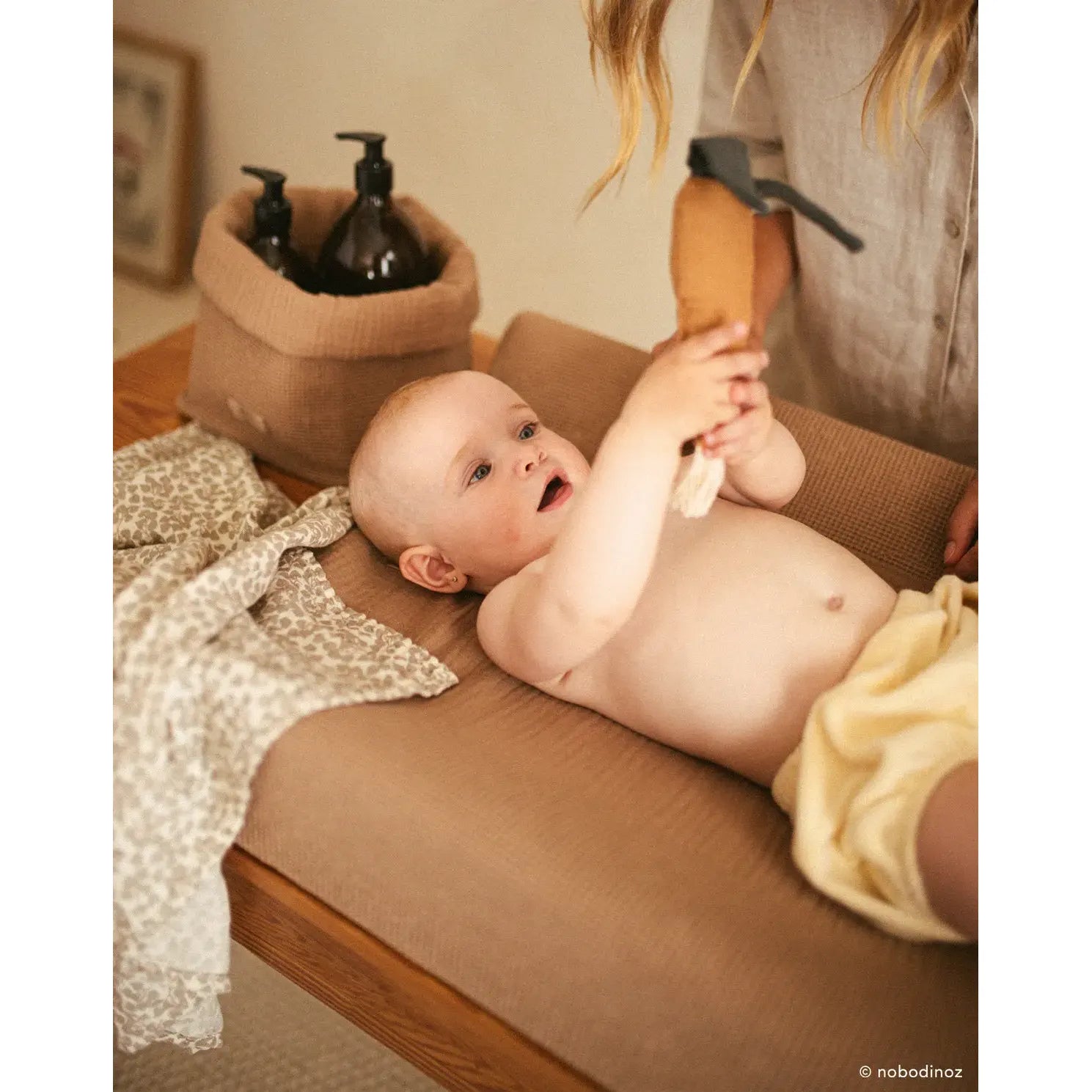 El cambiador resulta ser un gran aliado para cambiar al bebé. Gracias a los bordes redondeados del cambiador impermeable, tu bebé está bien acomodado y lo mantienen en su sitio. Muy elegante, la funda cambiador Wabi-Sabi juega con las texturas combinando la elegancia del nido de abeja con la comodidad de la doble gasa de algodón orgánico, extrasuave para la delicada piel de tu bebé. Para tenerlo todo a mano, completa el cambiador del bebé con nuestras cestas de almacenaje.