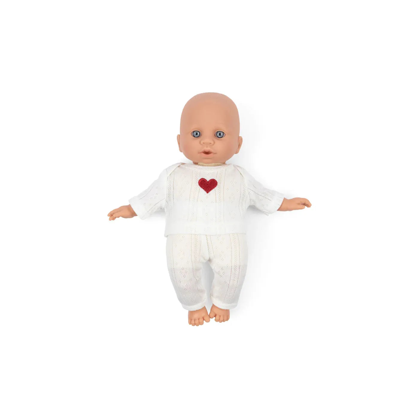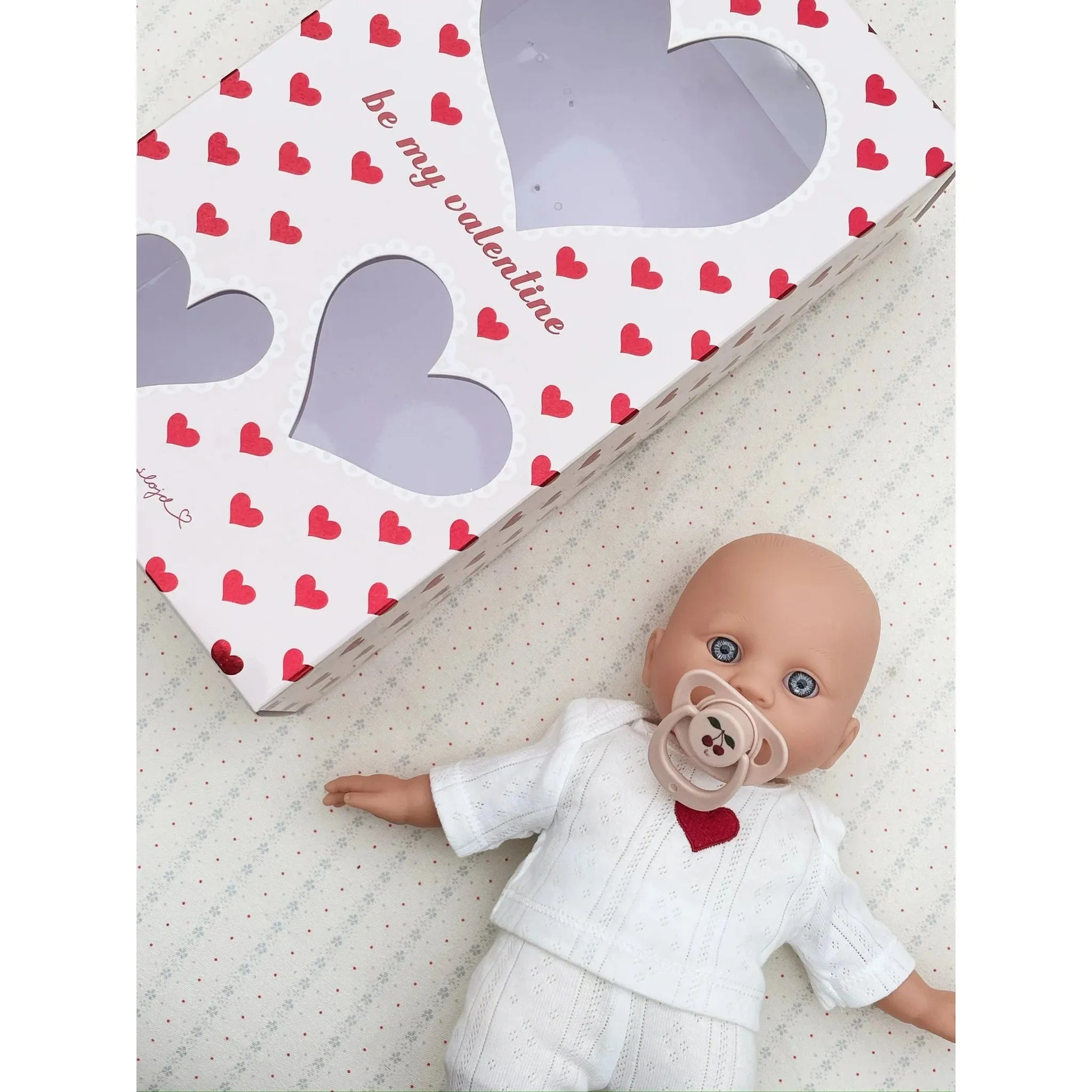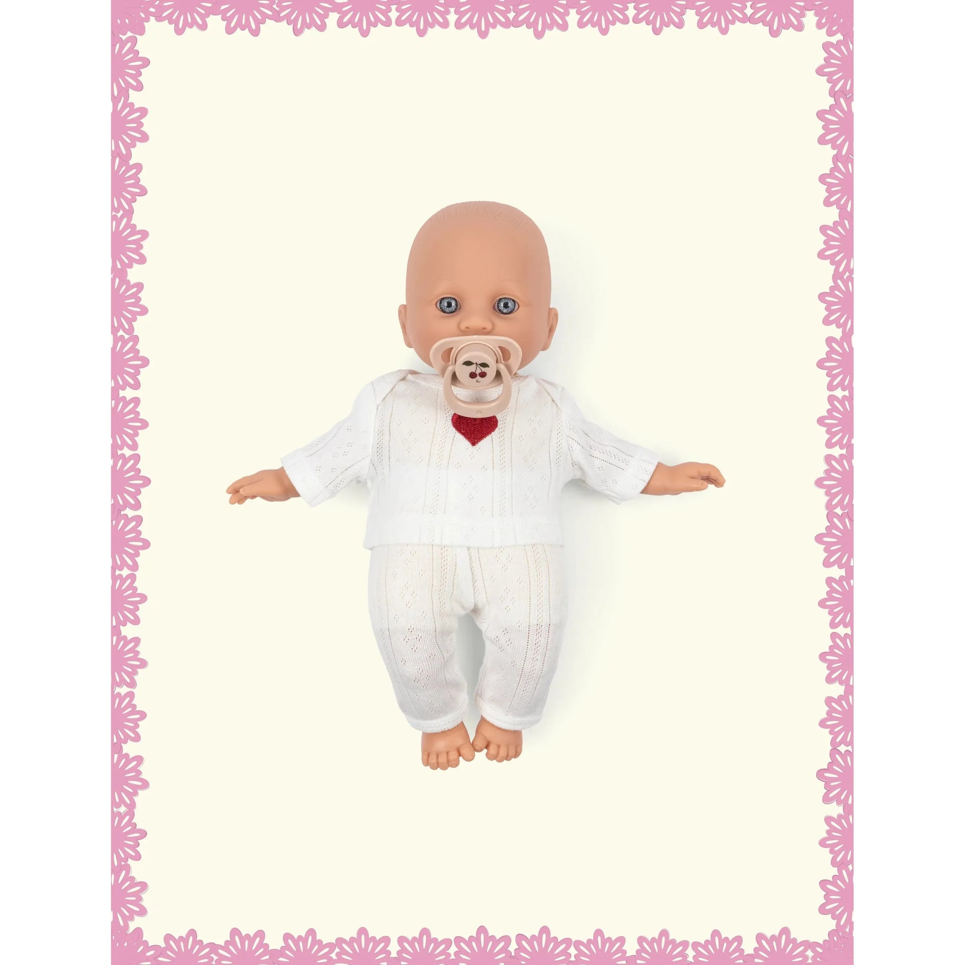 Nuestra muñeca Nelly es tu nueva mejor amiga. Perfectamente suave y mimosa con su pijama de algodón de dos piezas y su chupete relajante. Diseñada con ojos vibrantes, profundos y colores realistas.