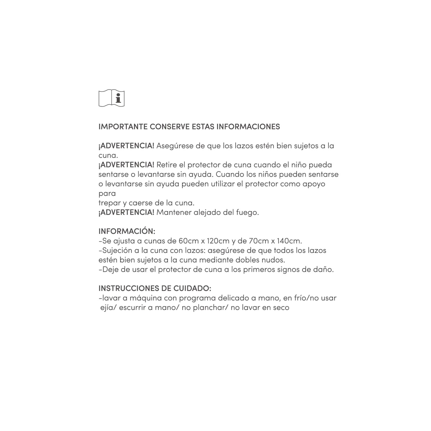 - Detalles:Funda extraíble con cremallera, 8 nudos para atar a la cuna y se adapta a cunas de 60 x 120 cm y 70 x 140 cm