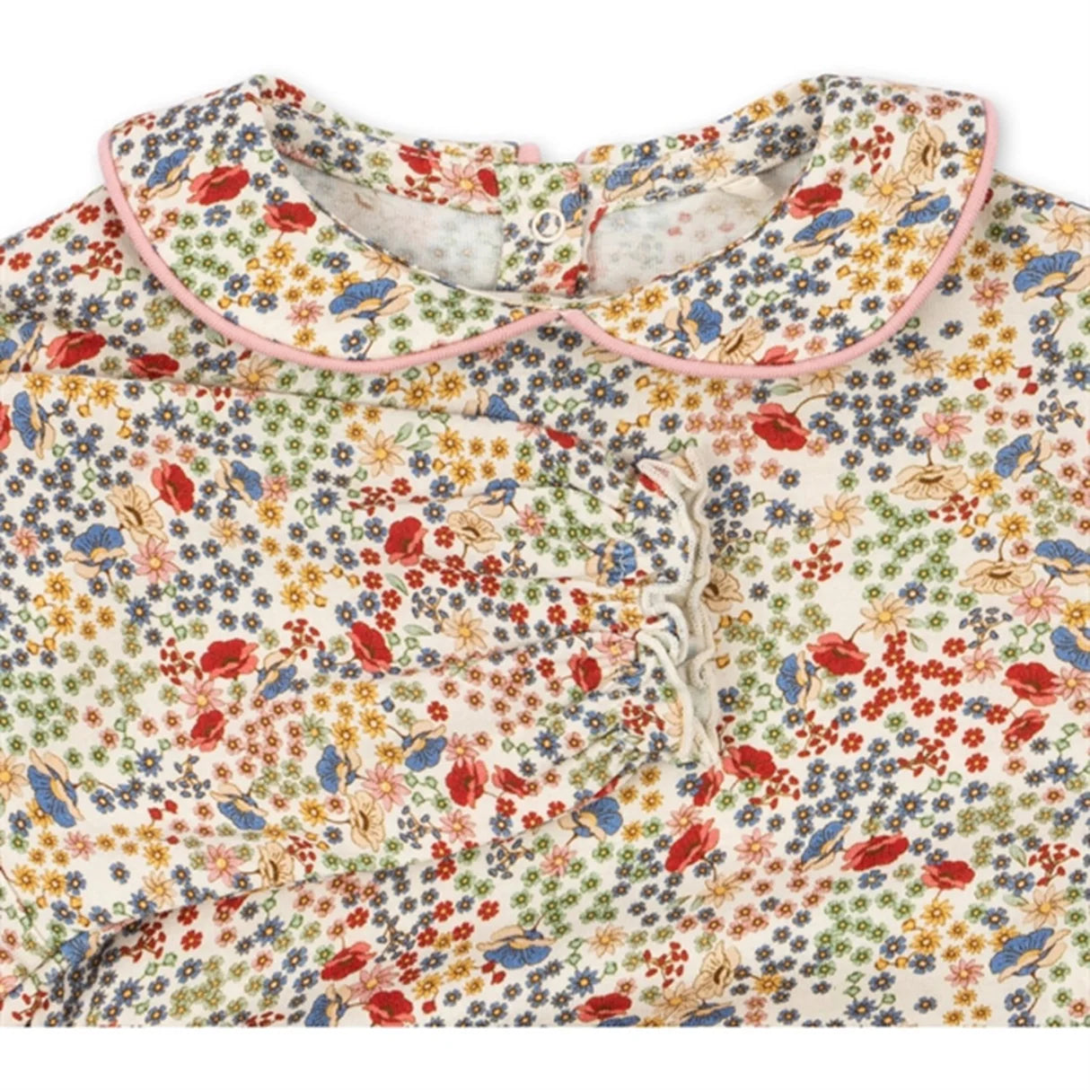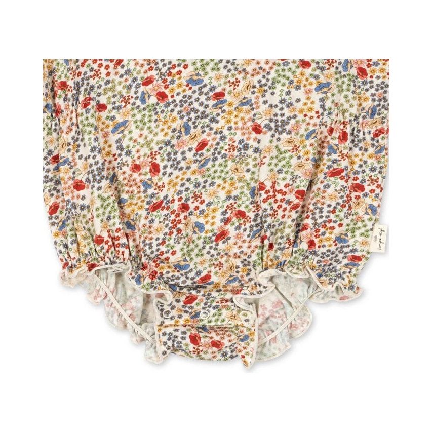 Precioso body con cuello de Konges Sløjd. Luce un precioso estampado floral y un cuello que lo remata. Las mangas y la parte inferior tienen preciosos volantes, ¡así que también puedes llevarlo con medias! El mono tiene botones en la espalda, así que es fácil de poner y quitar.