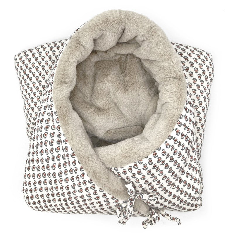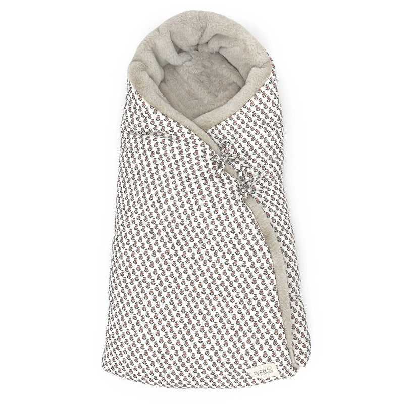 Se cierra mediante los lacitos de lino laterales. La parte inferior del saco se puede abrir con cremallera para que puedas introducir al bebé más cómodamente. Exterior en gasa de algodón orgánico estampada. Interior en tejido polar beige ultra-suave. la base del saco tiene aperturas para que lo puedas colocar en sillitas de grupo 0.