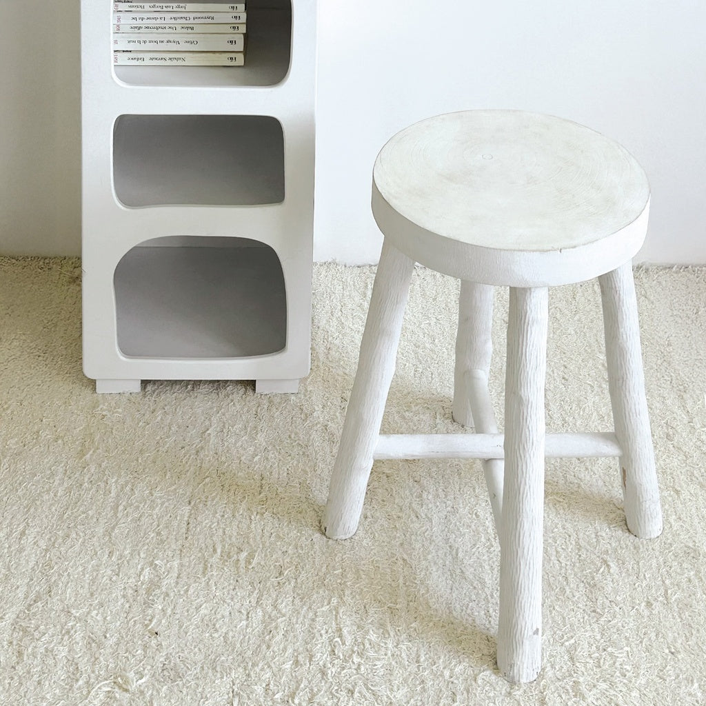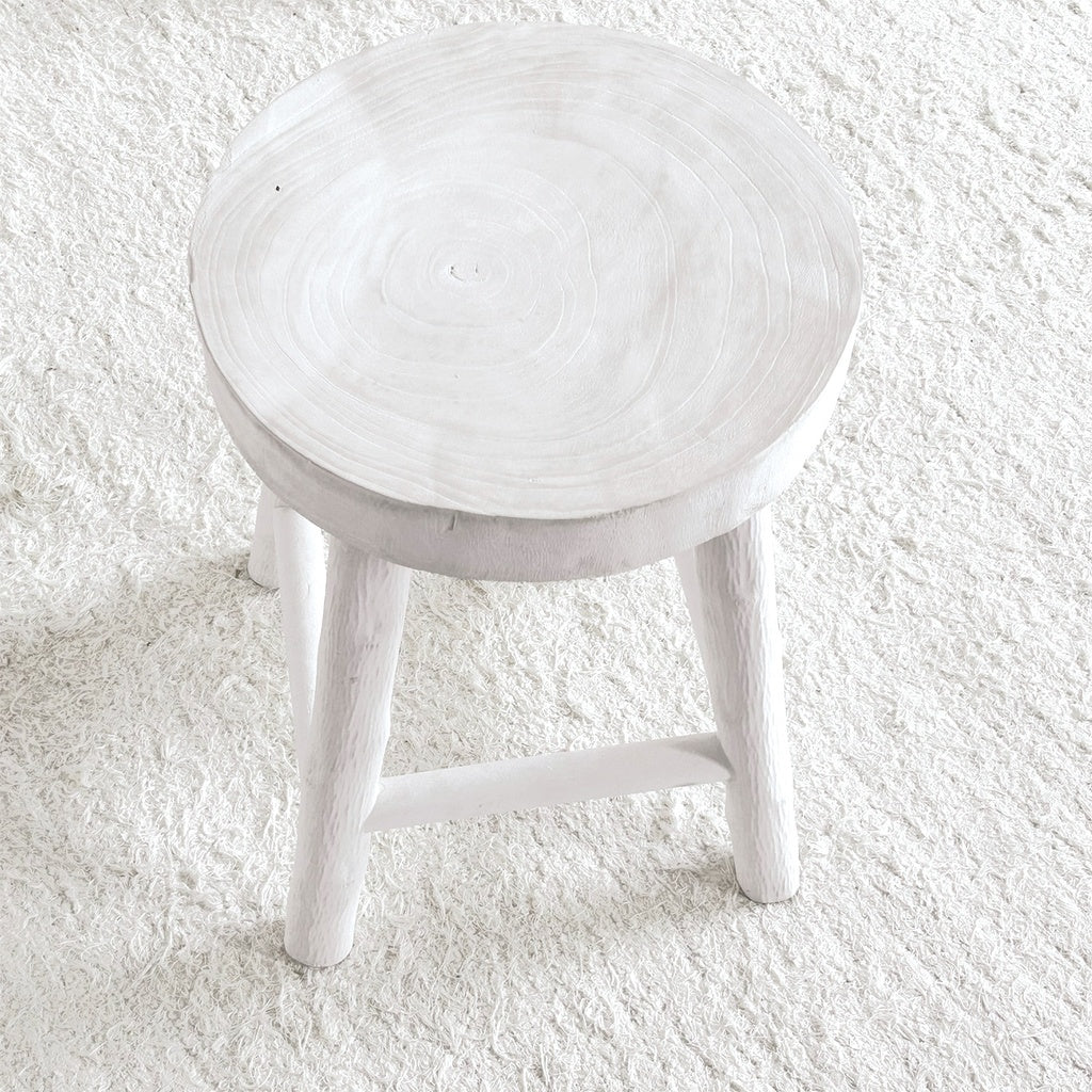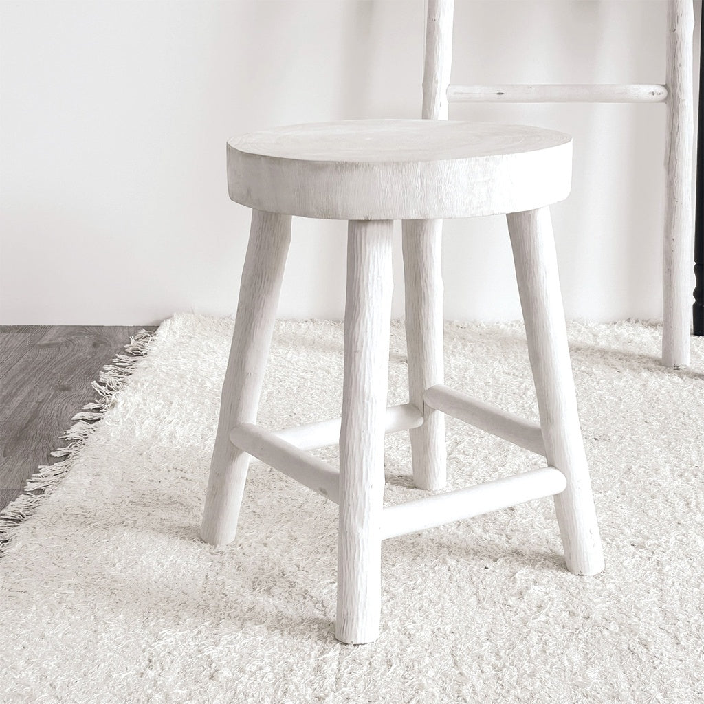 Taburete de madera de Paulownia blanca con asiento redondo. Elaborados artesanalmente, estos muebles son únicos, por lo que las dimensiones pueden variar ligeramente de un mueble a otro.