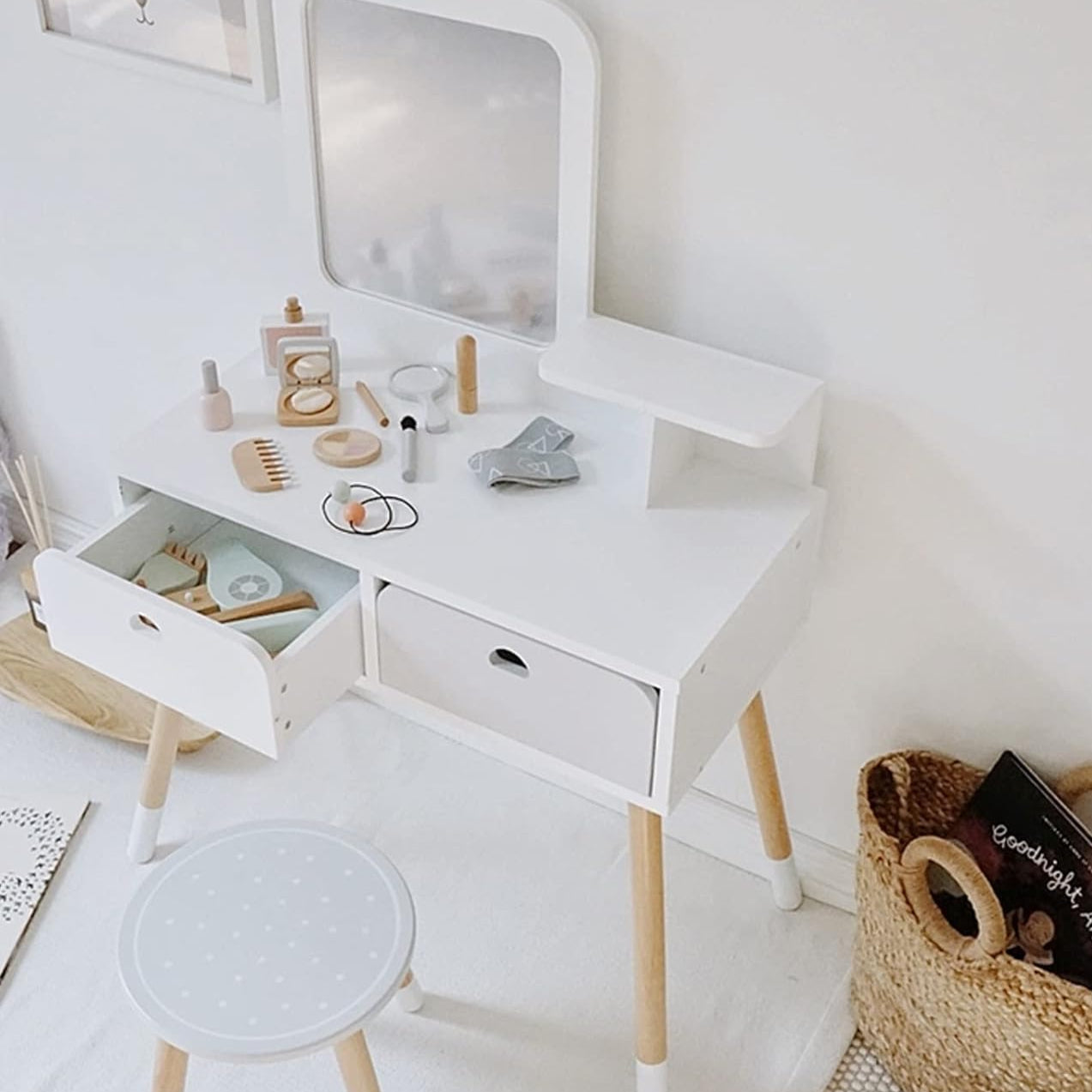 ¡El complemento perfecto para el rincón especial de tus peques! Este tocador destaca por su diseño encantador, por sus tonos neutros, y su estructura robusta que ofrece estabilidad y durabilidad. El toque final lo da el espejo montado, ideal para que los más peques puedan verse mientras juegan. Viene un taburete y 2 cajones amplios, perfectos para guardar juguetes y accesorios. Incluye una gama de complementos fabricados en madera pintada como: un secador de pelo, cortador de pelo, esmalte de uñas, peineta, espejo de mano, tijeras, perfume, sombras de ojo, alisador de pelo, lápiz de labios, pincel, pinta labios, polvos bronceantes cintillo y collets. Todos estos elementos fomentan el juego simbólico, una parte fundamental del desarrollo infantil. El juguete está pensado para adaptarse a la metodología Montessori, promoviendo la autonomía de los peques en actividades cotidianas como peinarse, limpiarse los dientes o vestirse. En definitiva, no solo es funcional y estético, sino que también es una excelente herramienta educativa que ayudará a tus hijos a desarrollar su independencia y creatividad.