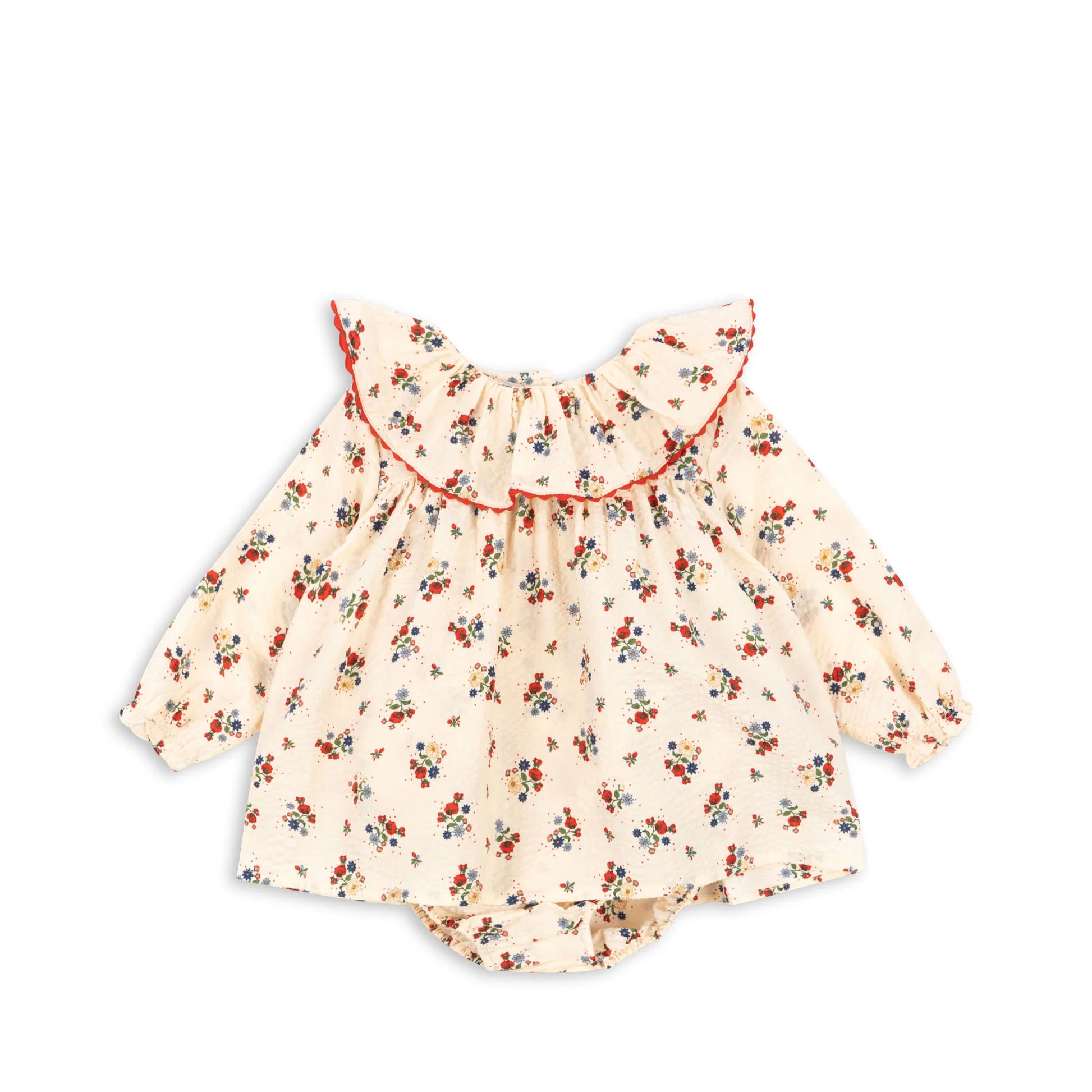Este mono con volantes Bella de Konges Slojd tiene mangas largas con volantes en los extremos. Hermoso y funcional, este mono para niña presenta un bonito estampado floral y broches en la parte inferior para cambiarlo fácilmente. El algodón orgánico certificado por Gots hace que este mono sea ideal para pieles sensibles.
